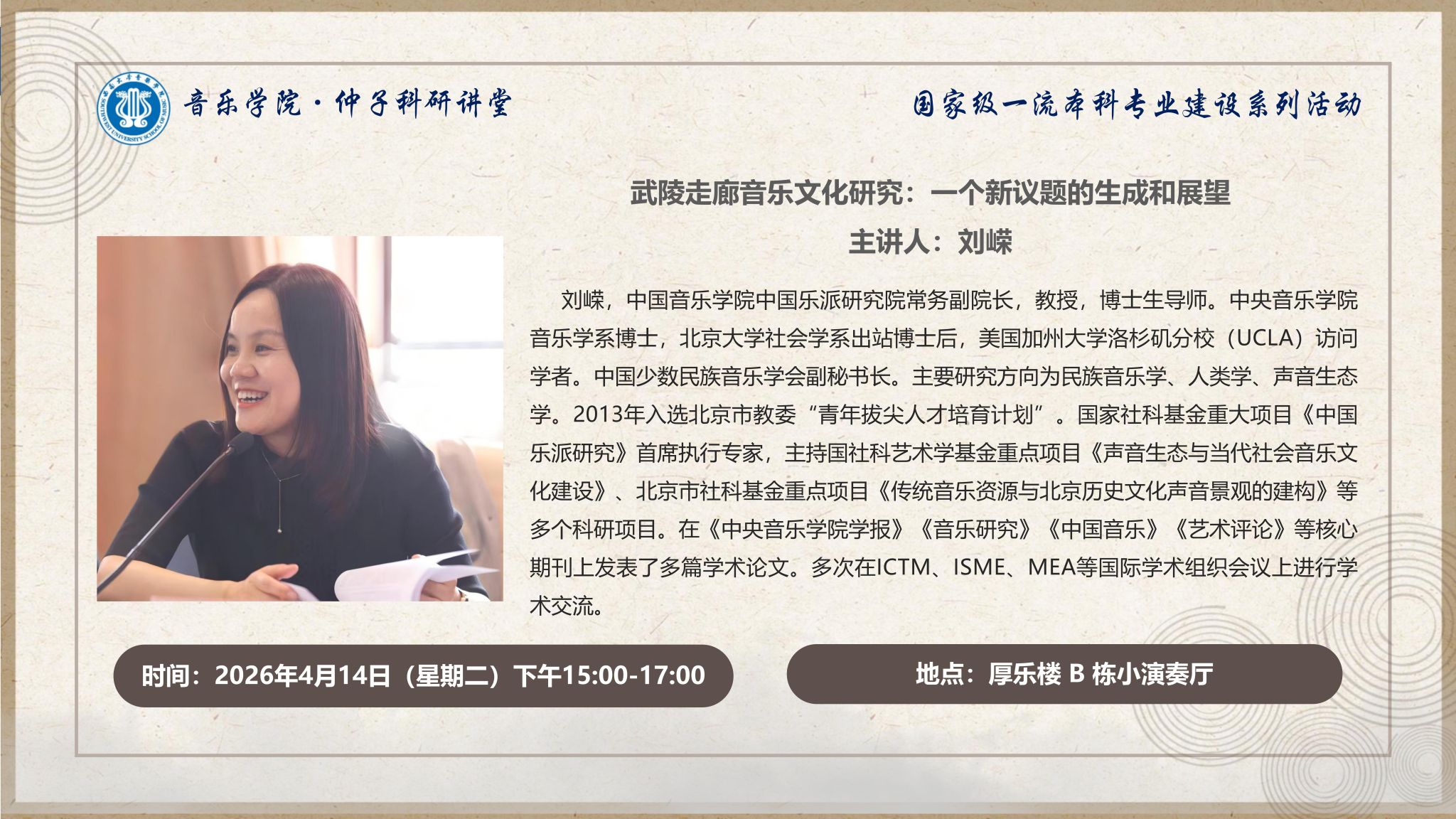 仲子科研讲堂|4月14日15:00-17:00刘嵘:《武陵走廊音乐文化研究:一个新议题的生成和展望》