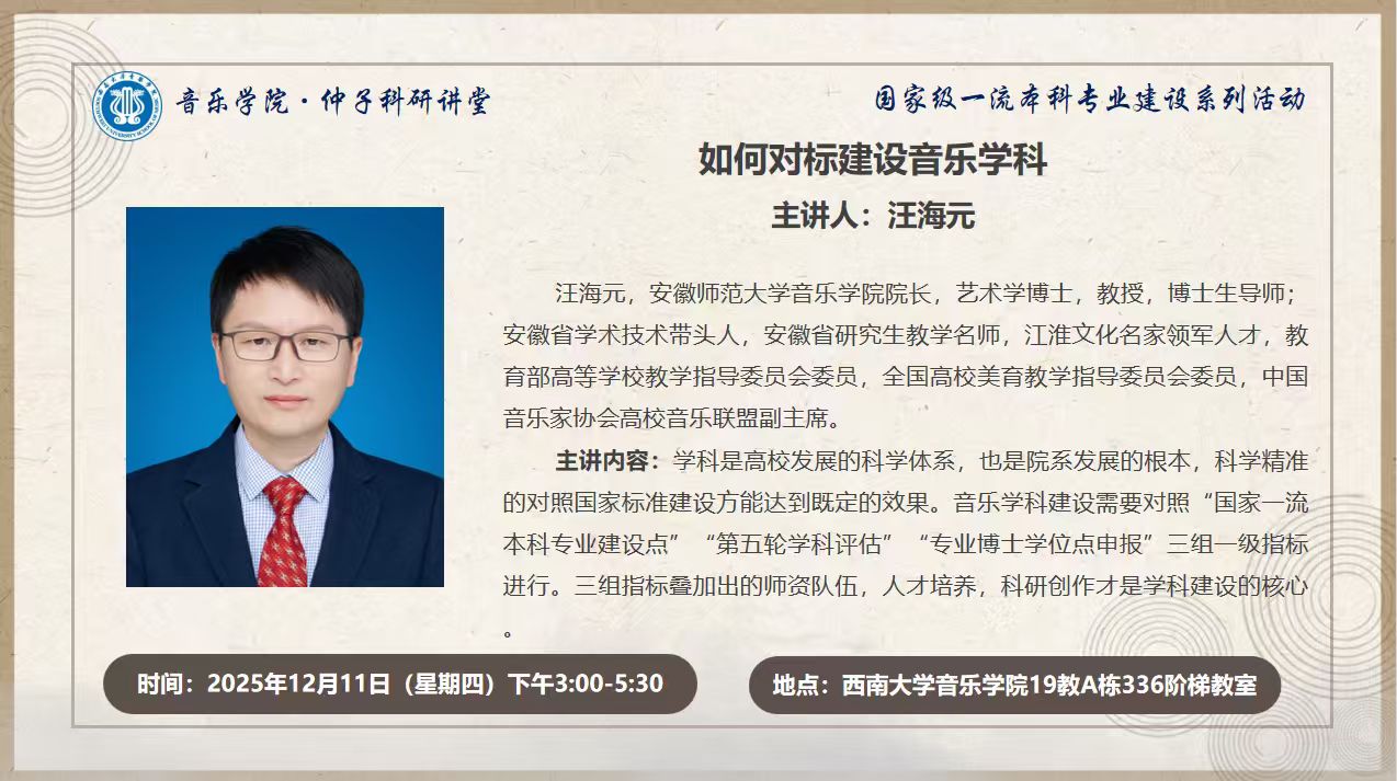 仲子科研讲堂|12月11日15:00-17:30汪海元:《如何对标建设音乐学科》