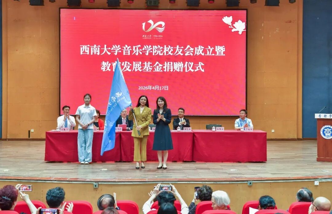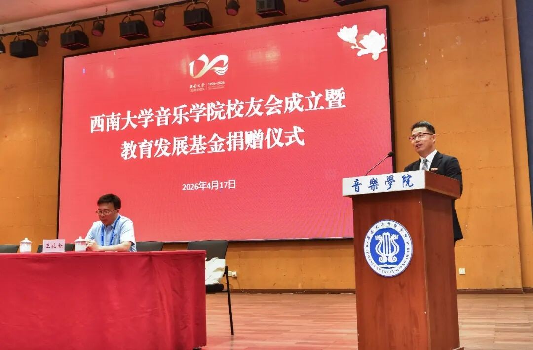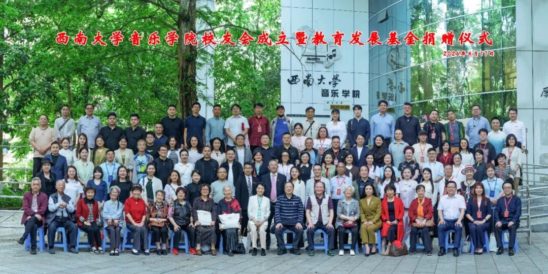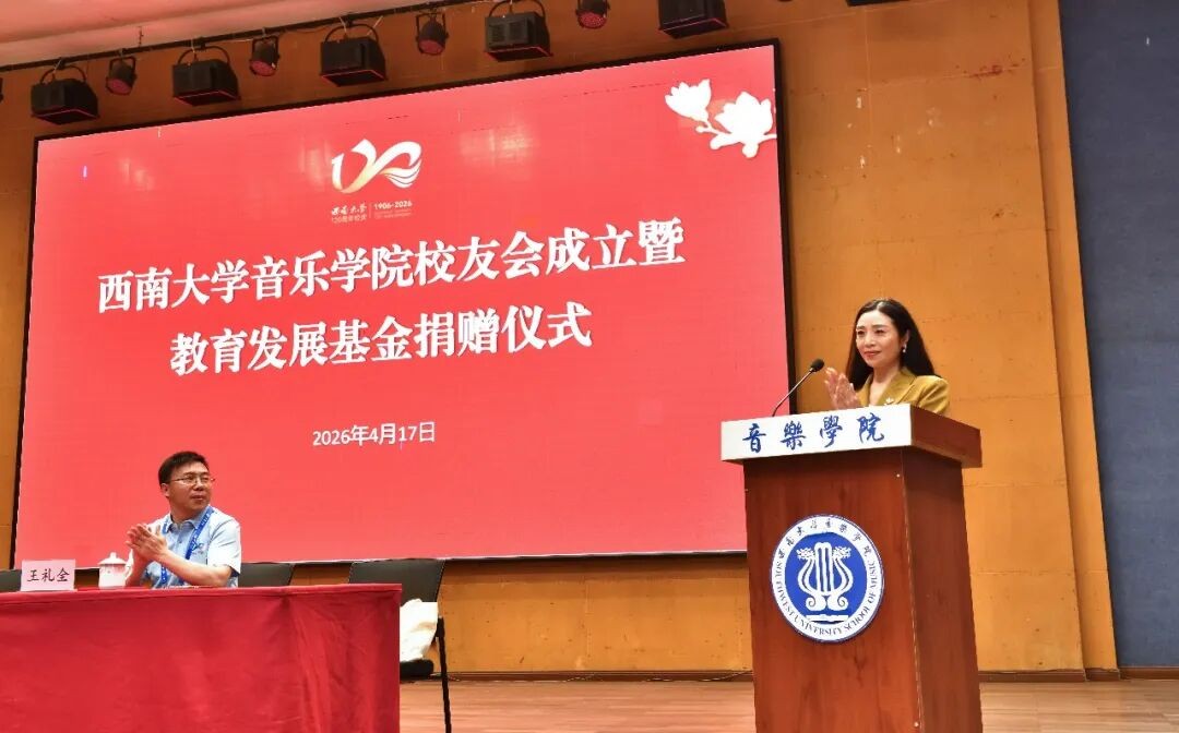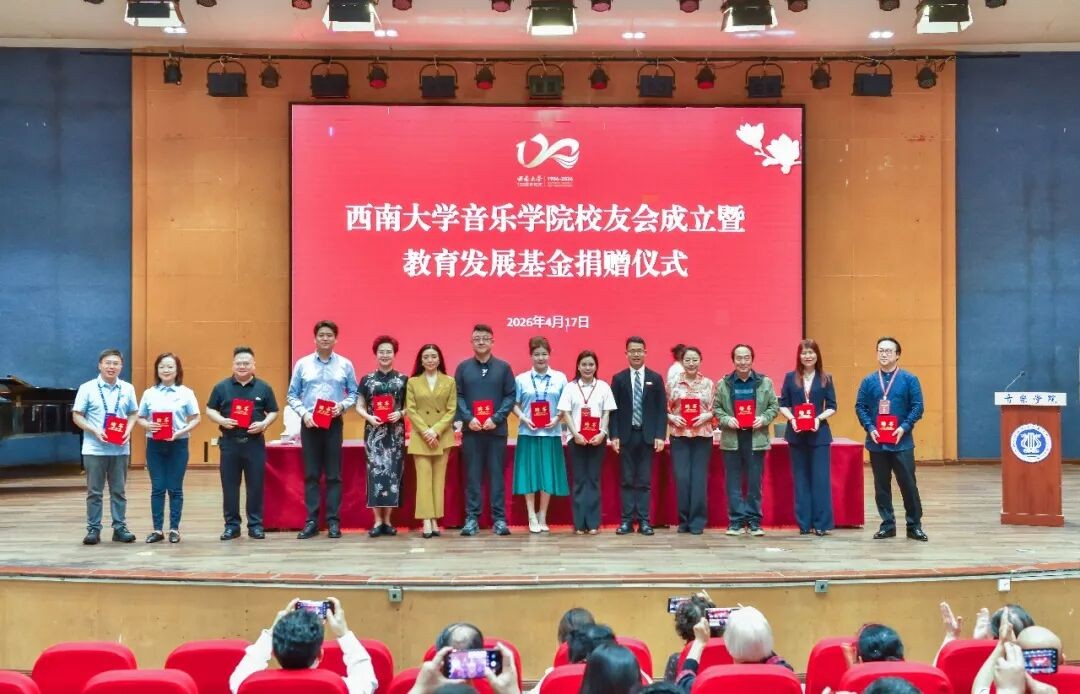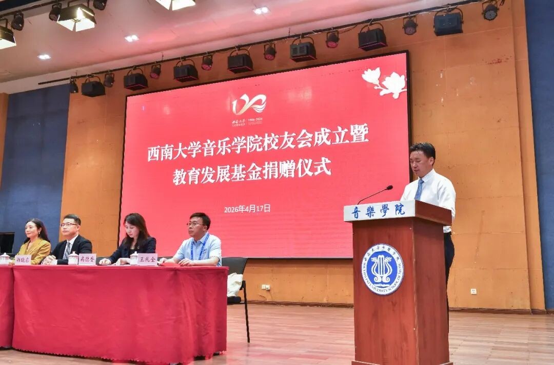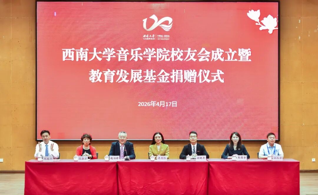 百廿西大,弦歌不辍;乐苑新篇,共绘华章。为庆祝西南大学建校120周年,进一步凝聚校友力量,促进学院与校友间的交流合作,2026年4月17日15时00分,西南大学音乐学院校友会成立暨教育发展基金捐赠仪式在学院小演奏厅内隆重举行。西南大学校友总会副秘书长高德香、校友会名誉会长李丹阳、音乐学院党委书记魏培修、院长胡晓东、校友办公室主任刘春平、以及众多知名校友代表共同参与,仪式由魏培修书记主持,现场气氛庄重而热烈。