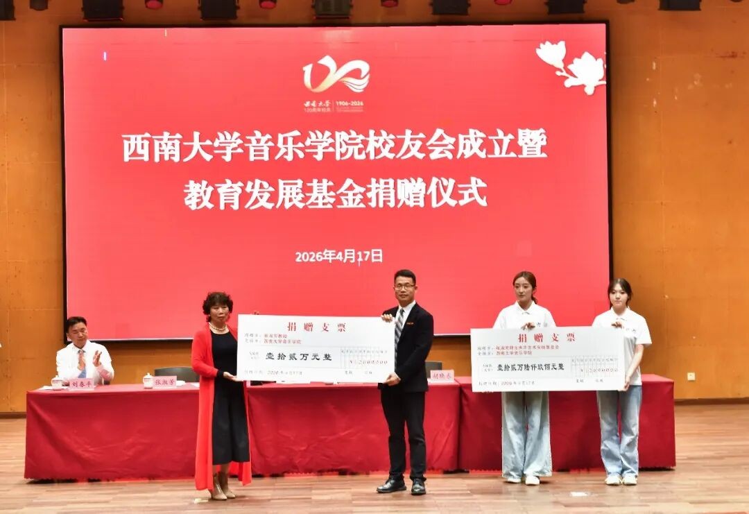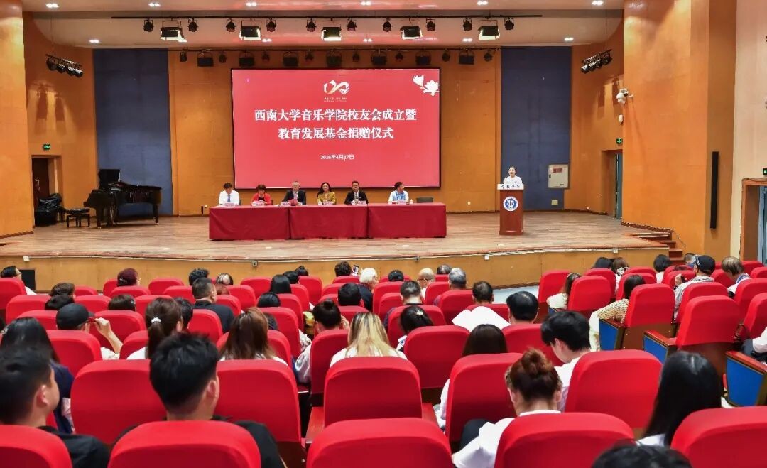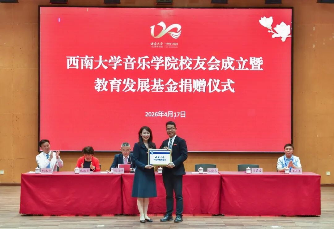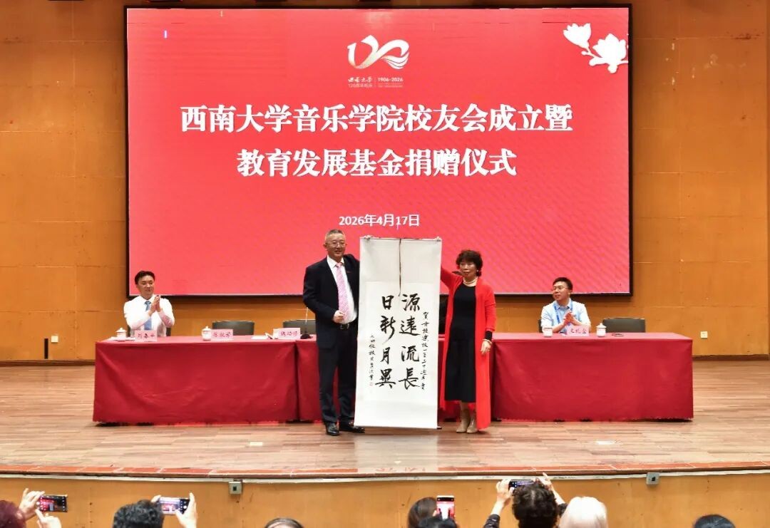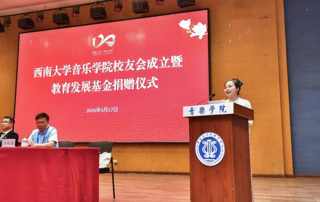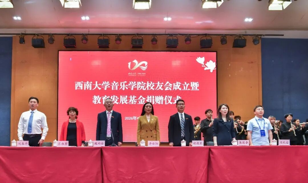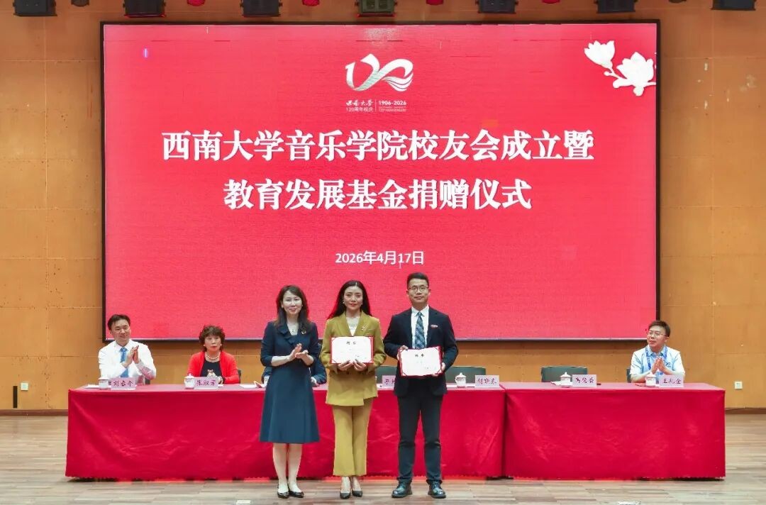 百廿西大,弦歌不辍;乐苑新篇,共绘华章。为庆祝西南大学建校120周年,进一步凝聚校友力量,促进学院与校友间的交流合作,2026年4月17日15时00分,西南大学音乐学院校友会成立暨教育发展基金捐赠仪式在学院小演奏厅内隆重举行。西南大学校友总会副秘书长高德香、校友会名誉会长李丹阳、音乐学院党委书记魏培修、院长胡晓东、校友办公室主任刘春平、以及众多知名校友代表共同参与,仪式由魏培修书记主持,现场气氛庄重而热烈。