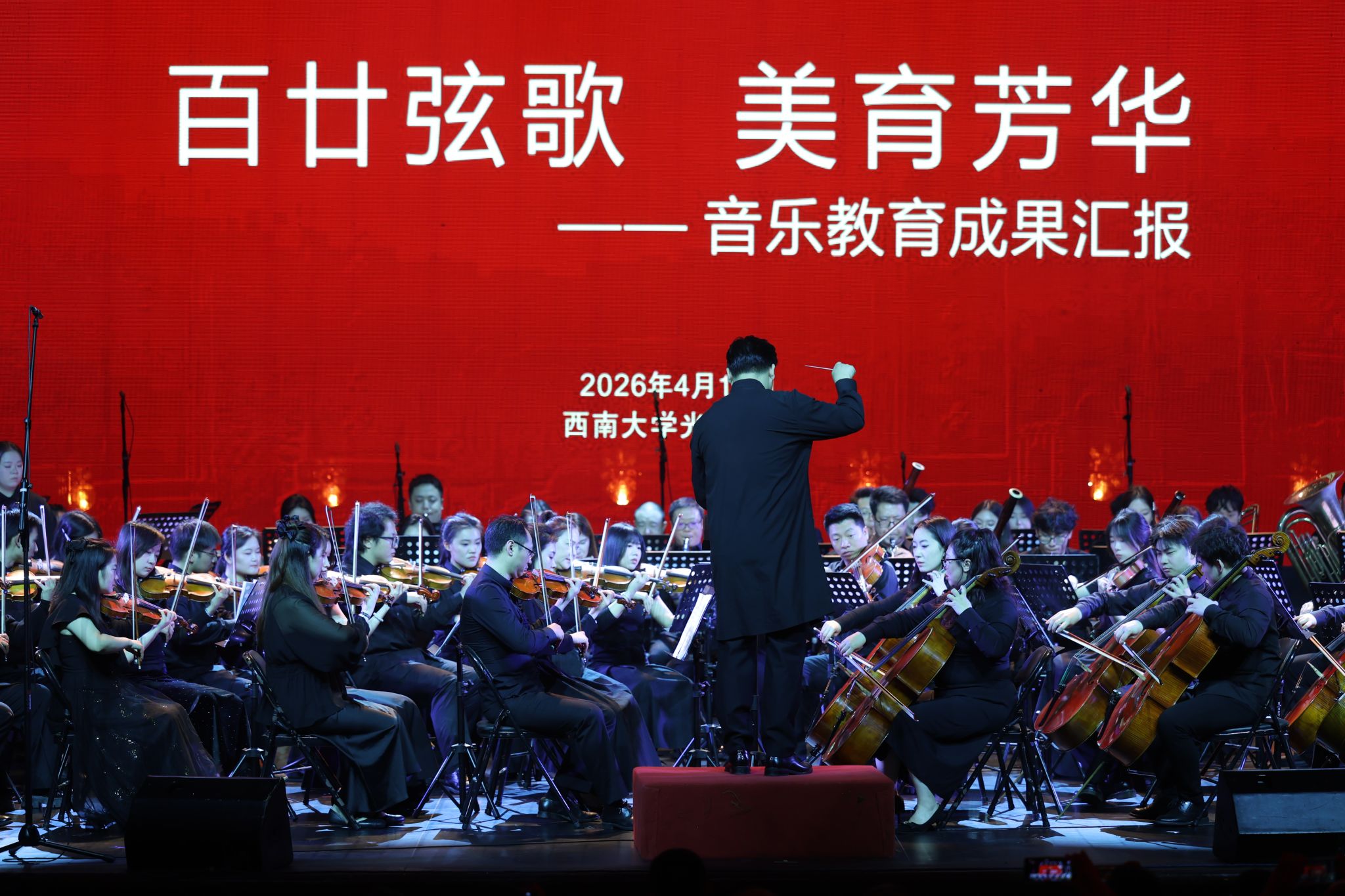 中场过后,交响诗《红旗颂》、管弦乐《人民万岁》《威风堂堂进行曲第一号》精彩上演,以磅礴气势展现专业水准,将现场氛围推向高潮。演出尾声,《在希望的田野上》歌声昂扬,《西南大学校歌》引发全场大合唱,师生校友同声共祝母校百廿华诞,现场掌声与欢呼声经久不息。