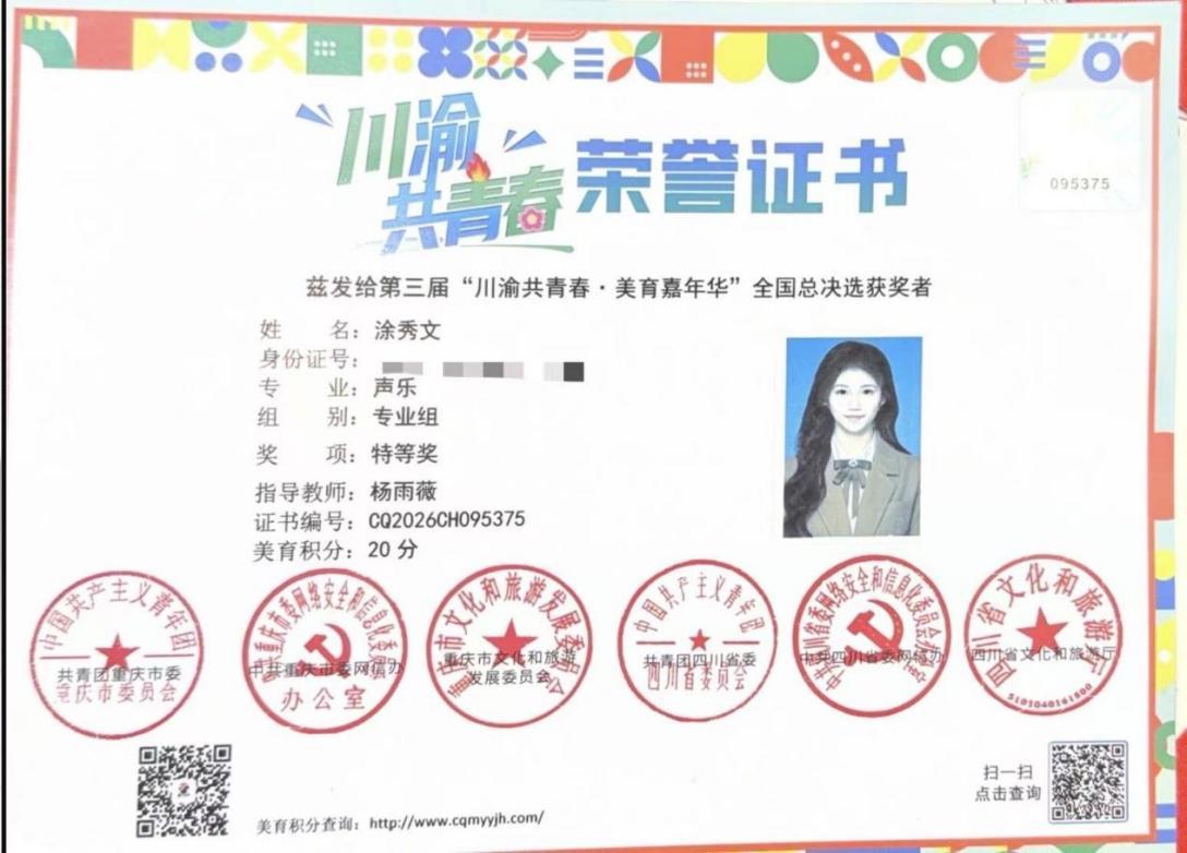 近日,由共青团重庆市委、共青团四川省委、中共重庆市委网信办、中共四川省委网信办、重庆市文化和旅游发展委员会、四川省文化和旅游厅联合主办的第三届“川渝共青春 美育嘉年华”文化艺术活动圆满落幕,音乐学院音乐学(师范)专业学生涂秀文(指导教师:杨雨薇)凭借作品《川江号子》在声乐专业组通俗演唱类别中脱颖而出,斩获该组别第一名,获得特等奖。