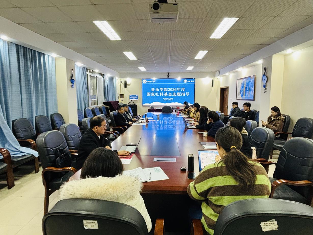 西南大学音乐学院于2025年12月26日召开2026年国家社科基金选题论证指导暨申报动员会议,旨在帮助教师精准把握选题方向、提升申报书质量与立项成功率。会议特邀湖南师范大学教授、博士生导师、中国艺术人类学学会副会长赵书峰莅临指导。 12月26日上午,国家社科基金选题指导会议于105会议室举行,会议由院长胡晓东教授主持。赵书峰教授采用“点对点”精准辅导模式,对十四个选题逐一剖析点评。他首先肯定了选题整体质量有所...