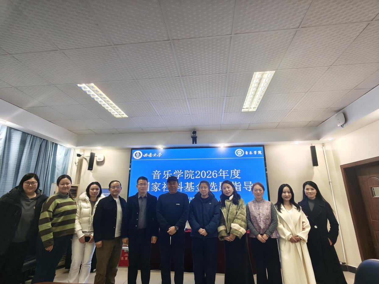 西南大学音乐学院于2025年12月26日召开2026年国家社科基金选题论证指导暨申报动员会议,旨在帮助教师精准把握选题方向、提升申报书质量与立项成功率。会议特邀湖南师范大学教授、博士生导师、中国艺术人类学学会副会长赵书峰莅临指导。