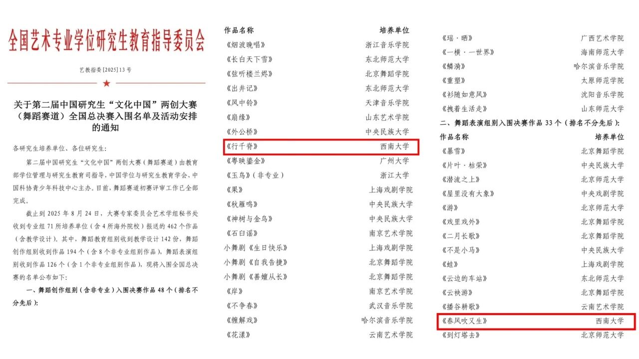 近日,全国艺术专业学位研究生教育指导委员会发布了《关于举办“第二届中国研究生‘文化中国’两创大赛(舞蹈赛道)”入围全国总决赛结果及活动安排的通知》。西南大学音乐学院作品《行千脊》入围舞蹈创作组别决赛;作品《春风吹又生》入围舞蹈表演组别决赛。
