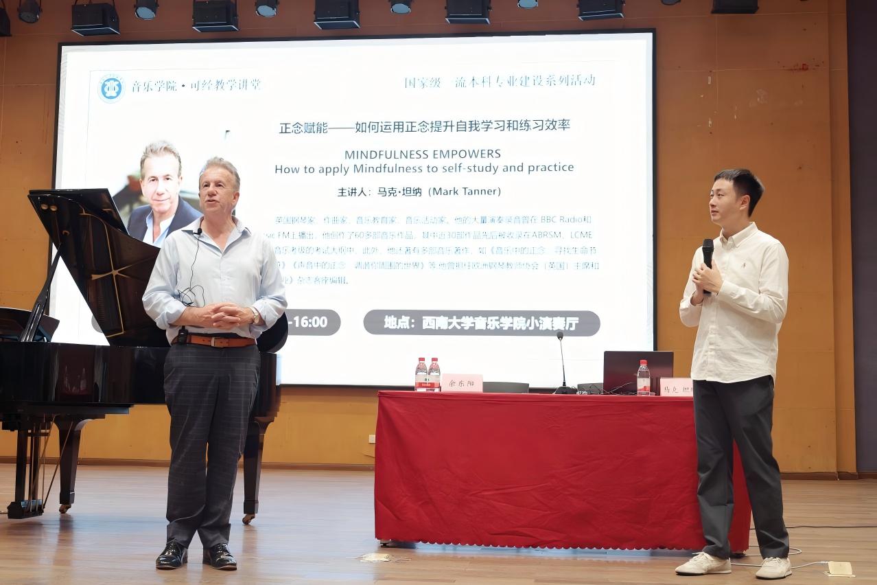 10月9日下午2:30,《正念赋能—如何运用正念提升自我学习和练习效率》专题公开课于西南大学音乐学院小演奏厅成功举办。本次公开课由英国钢琴家、作曲家和教育家马克·坦纳(Mark Tanner)博士主讲,由英国皇家音乐学院硕士余东阳担任翻译,公开课吸引了学院师生以及校内外音乐爱好者到场聆听。