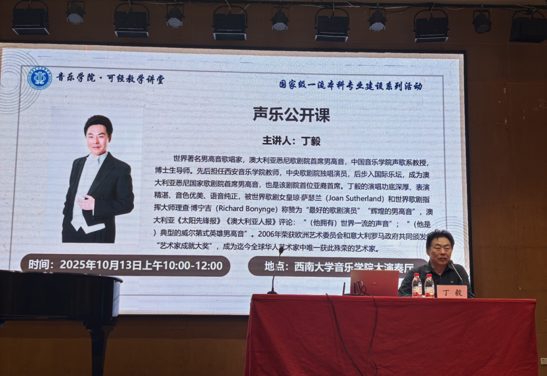 10月13日星期一上午10:00,世界著名男高音歌唱家、澳大利亚悉尼歌剧院首席男高音、中国音乐学院声歌系教授、博士生导师丁毅声乐公开课在西南大学音乐学院小演奏厅成功举行。公开课伊始,音乐学院举行了特聘教授及特聘研究生导师聘任仪式。西南大学党委常委、副校长廖晓衡研究员,音乐学院党委书记魏培修同志、院长胡晓东教授和副院长陈若旭教授出席仪式,仪式由胡晓东院长主持。