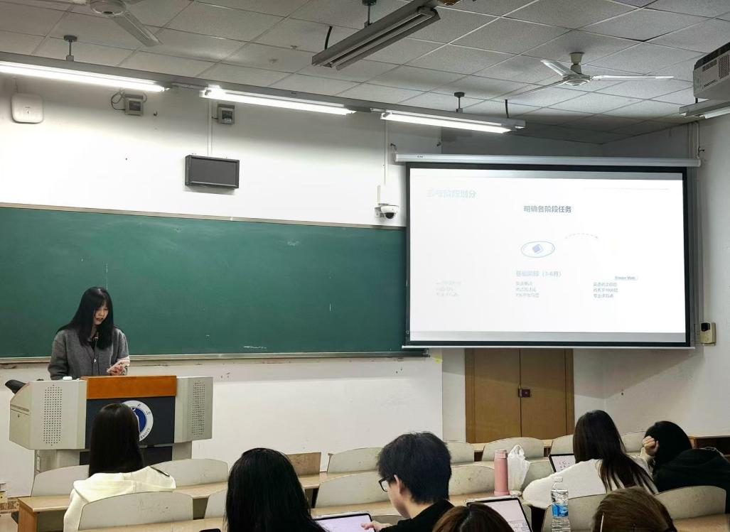 宋了然学姐以“科学规划+高效执行”为核心,结合自身备考经历展开细致讲解:在备考阶段划分上,她将全年备考拆解为基础夯实、强化突破、冲刺模拟三个阶段,明确各阶段核心任务,帮助同学们避免“前松后紧”的备考误区;针对736作品分析这一专业难点,她结合真题实例,分享了“作品结构拆解+风格特征提炼+答题逻辑梳理”的实用方法,建议同学们多积累经典作品案例,建立专属错题本;在工具推荐环节,她重点介绍了墨墨背单词APP、番茄钟、扇贝考研、kimi等学习类工具,详解如何利用工具实现单词高效背诵、时间精准管理与专业资料快速检索,提升备考效率。